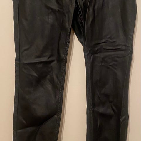 Myydään polan Mustst leggenssit,pehmeää nahkaa. Housut joustaa päällä. Koko L ja vastaa kokoa. Materiaali on 95% polyesteria ja 5% Elastiinia.Mukavat päällä.