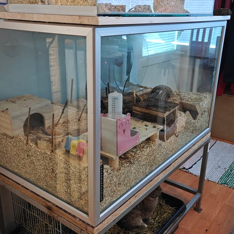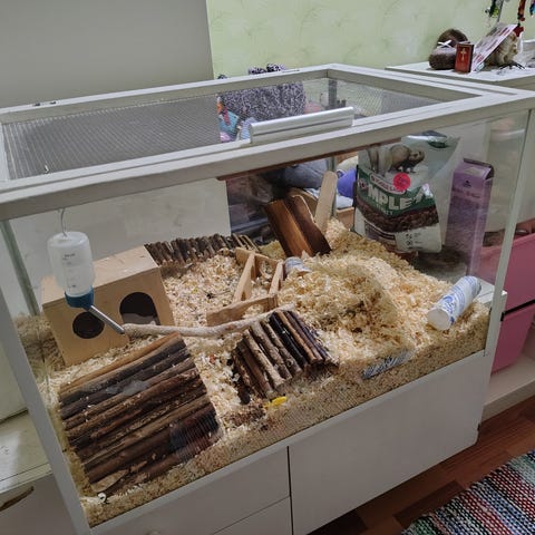 Iso akvaario/Terraario kannella ja jaloilla/korekkella, kaksi juoksu pyörää toinen on isonpi, vesipulloo, kulhoja, pieniä mökkejä 4 ja kaksi isoa, 1 alusteite/pohja, puu kiipeilu/lohkero systeemi (en ole varma mikä nimeltään oli mutta kuitenkin eläin kaupasta ostettu 100% turvallinen jokaselle jyrsiälle.), Puu siltoja yksi iso ja pieni, kova heinä tunneli ja normi kova pahvi keski kokoinen tunneli, yksi pieni kukkaruukku ja keskisuuri. Löytyy myös kantokoppa hamsterille jos haluaa mukaan ottaa.