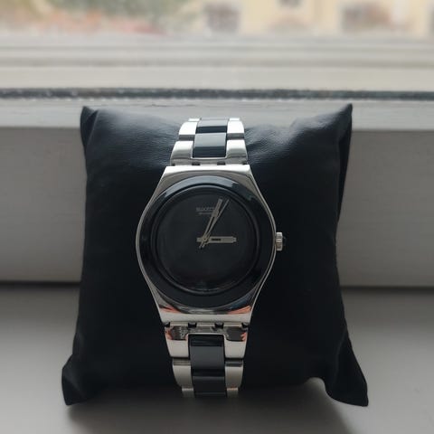 Swatchin rannekello, jossa lähimaksu mahdollisuus NFC:n ja SwatchPAY -sovelluksen kautta.