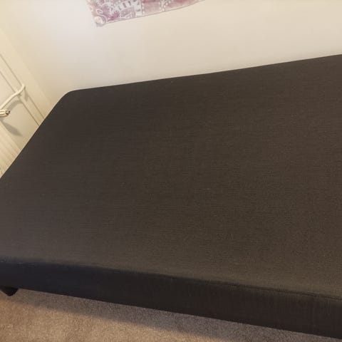 Kaksi samanlaista vaalenavihreää sänkyä ja patjat. Mitat: pituus 206, leveys 98cm