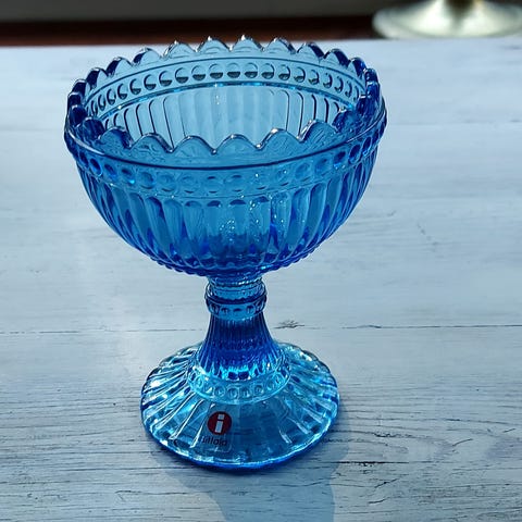 Iittala Mariskooli 120mm, valmistettu punaisesta lasista. Uudempaa tuotantoa ja tässä jo kohokuvioituna Marimekko teksti pohjassa. Iittala tarra tallella.