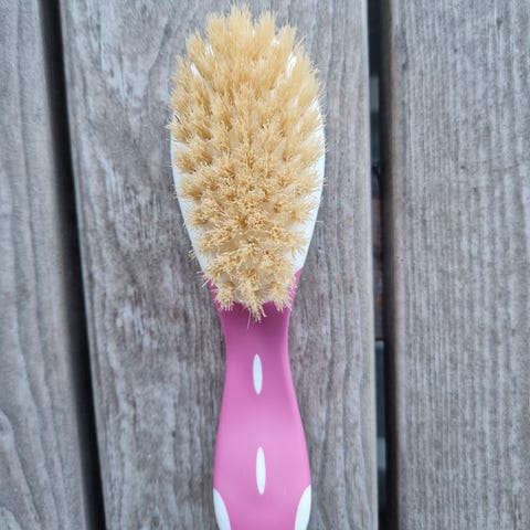 Luonnonharjasta ja puuta. Ostettu Saksasta Rossmannilta. Harjan koko pituus 15 cm.