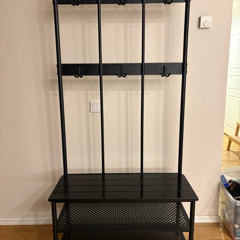Uutta vastaavassa kunnossa, puoli vuotta vanha Ikean Nipåsen naulakko penkillä ja kenkähyllyillä.