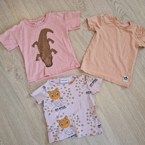 Vihreä Mini Rodinin paita, jossa helmassa pientä kulumaa. Keltainen Omin paita, jossa myös helmassa pientä kulumaa. Ja valkoinen Noshin paita jonka toisessa hihansuussa tummentumaa sekä selkäpuolella pientätahraa.