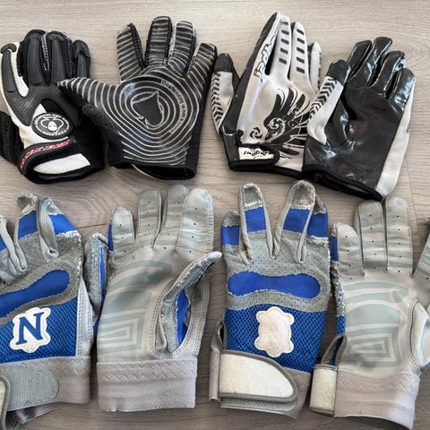 Catmandoo urheilukäsineet sininen, musta ja valkoinen väri. Käsineissä on vahvistetut alueet kämmenpuolella ja joustava materiaali ranteessa.