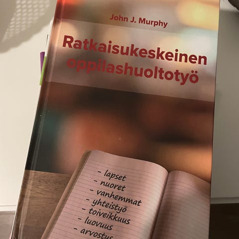 John J. Murphy Ratkaisukeskeinen oppilashuoltotyö kirja käsittelee oppilashuollon menetelmiä ja lähestymistapoja, mukaan lukien lapset, nuoret, vanhemmat, yhteistyö, työkalut, keveyys ja arviointi (ovh 43€).