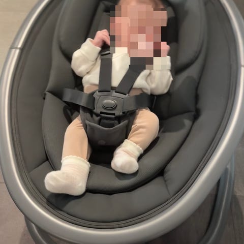 Vauvan sitteri harmaalla verhoilulla ja valkoisella rungolla. Sitterissä on turvavyöt ja pehmustettu istuin. Soveltuu vauvoille rauhoittumiseen.