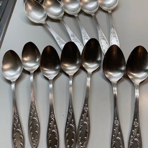 Gense Pintahopeoidut.Saadaan upeakattaus 8. lle henkilölle.Sisältää alkupala haaruka ja veitset.Pääruoka haarukat ja veitset.Keittolusikat ja jälkiruoka lusikat .Kahvilusikoita 4 kpl.Tarjouluun 2 kpl isoa lusikkaa.haarukoita Valmistettu ruostumattomasta teräksestä. Aterimet on säilytyslaatikossa, joka on valmistettu puusta ja jossa on sininen samettivuoraus. Sopii kattaukseen ja päivittäiseen käyttöön.Merkki on SIlver playerin cutlery BY Grosvenor.G.