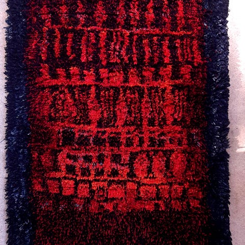 Leena-Kaisa Halmeen suunnittelema Kaskiryijy Villa, puuvillaloimi, metallitanko ripustamiseen. Nouto Tammela, Tampere