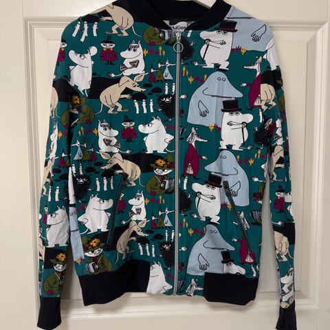 Aasiasta Muumi takki. Aihe on joku muumisarjakuva ja kieli englanti. Hihoissa ja alahelmassa kuminauha. Koosta ei tietoa.