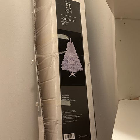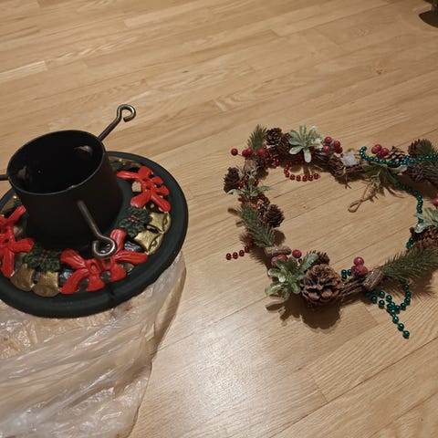Annetaan joulukoristeita, mm. matto kuusen alle, ovikranssi, kaksi hopeista köynnöstä, kaksi vihreää köynnöstä, pari poroa, kuusen koristeita yms.