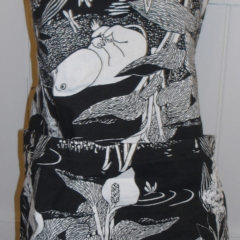 Yhden koon pikku Myy essu. Kerran pidetty. Joko koti essuksi tai askartelu essusksi, minkä käyttö tarkoituksen keksii. Pikku Myyn pää on tasku, sivuissa napit. Olen koko M ja ulottuu vajaan puoleen reiteen, on väljä.