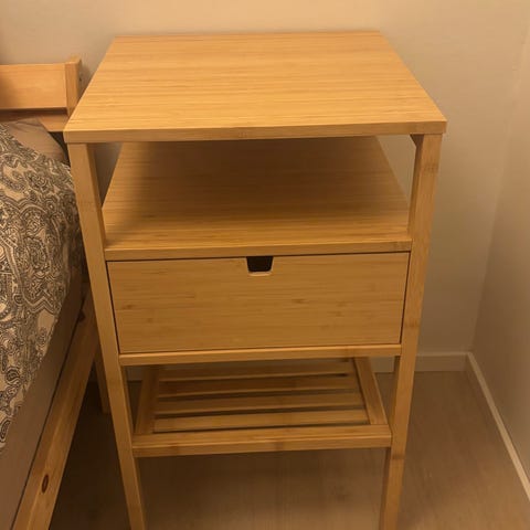 Hyvässä kunnossa oleva Ikean Vikhammer -yöpöytä. Uutena 90e. Nouto Jyväskylän Mäki-Matin S-marketilta.
