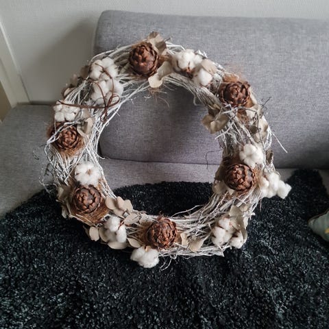: Kukkakaupassa sidonta-alan ammattilaisella teetetty iso puolikuun mallinen kranssi. Pituus sivusuunnassa 80 cm ja ympärysmitta 65 cm keskellä paksuimmalla kohdalla. Sidottu kullanvärisestä rottinkioksasta. Koristeena kultaista ja sinistä nauhaa, helmiä ja muita koristeita. Sisällä kullanvärinen rottinkipallo. Myynnissä Lohjalla, mutta kulkeutuu ilman postimaksua omien menojen mukaan Kamppiin.