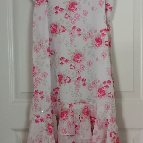 H&M tyttöjen mekko, koko 158, punainen väri. Mekko on valmistettu polyesteristä. Yläosa on koristeltu paljetein, alaosa on kevyttä ja läpikuultavaa materiaalia. Materiaalit mekossa polyesteri, viskoosi ja elastaani. Olkapäillä hieman korjausompelua eli kädenteitä hieman pienenetty.