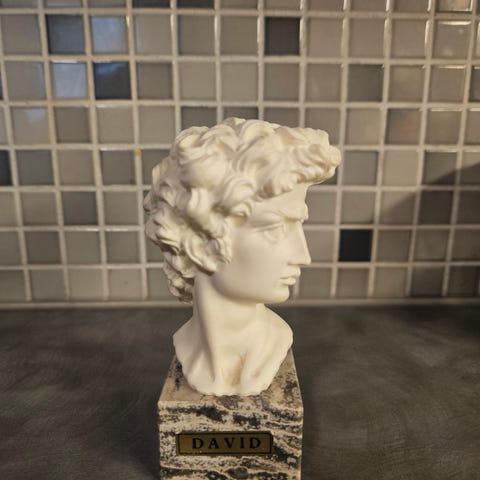 Myydään Daavid koristepatsas. Materiaalista ei tietoa, korkeus n. 23cm. Sopii koriste-esineeksi tai taidekokoelmaan.