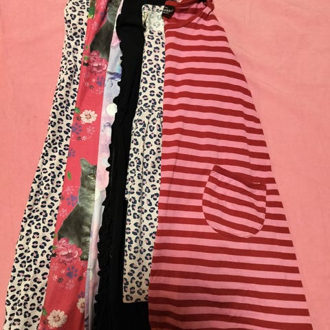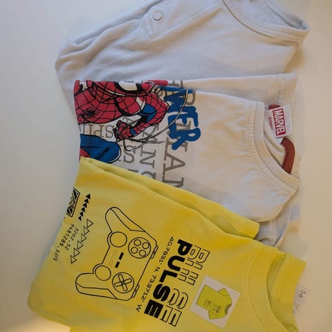 Kohtuullisessa kunnossa kahden pojan jäljiltä. Kuvissa merkit ja koot, mutta yleisesti ottaen noin 8-vuotiaalle. Dinosauruksia, legoja, skeittaamista, Adidasta ja Marimekkoa. Yhteensä 8 paitaa tai collegea.