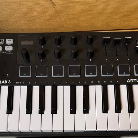 Arturian midi-keyboard jossa 49-kosketitinta. Yhden liu'un potikka on hävinnyt mutta liuku toimii ilman sitäkin.