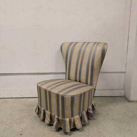 Siisti Emma-tuoli. Pehmeä maitokahvin tai hiekan sävyinen kangas. Ainoa vika on puujalkojen kulumajäljet. Voin hioa ja maalata tai lakata ne. Istuimen korkeus noin 40 cm. Leveys noin 53 cm ja syvyys noin 60 cm. Korkeus noin 83 cm. Postitus 25 euroa, tuonti (Helsinki, Espoo, Vantaa 10e, siitä lähipk-alueet 20e) tai haku. ● Myydyt suljen heti. ● En tee toridiilejä.