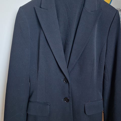 Cream-merkin tyylikäs musta bleiseri, jossa kullanväriset koristenauhat kauluksen reunoissa, takin alareunassa sekä taskujen yläosassa. Edessä 2 nappia ja vielä avaamattomat taskut koristeläpillä. Satiinivuori sekä kevyet olkatoppaukset. Takin pinta hieman liukkaampaa puuvillatrikoota. Laput leikattu. Hyvin vähällä käytöllä ollut hyväkuntoinen takki.