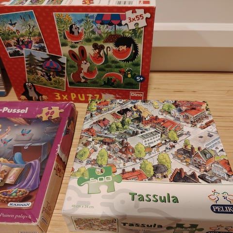 Palapelit. Palomies palapeli uusi ja muoveissa 15 palaa, Viiru x2 ja Muumi palapeleissä 20 palaa, kissa palapeleissä 24 palaa. 6e yhteensä.