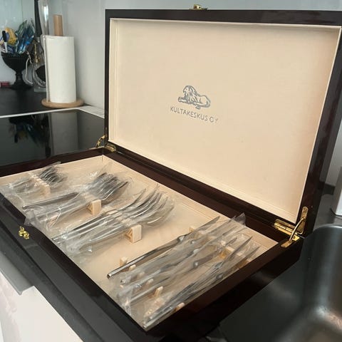 Veitsiä 12kpl, haarukat 8kpl, soppalusikka 10kpl ja kahvilusikka 12kpl. Postitus onnistuu tai nouto Kouvolasta.