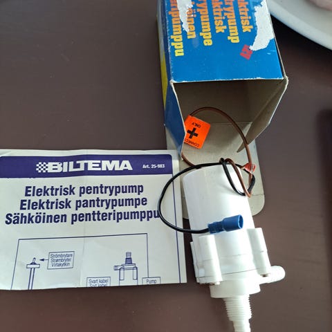 Rantalelun / uimapatjan pumppu kahdella erikokoisella suuttimella. Korkeus noin 37 cm, tilavuus 2,8 litraa.