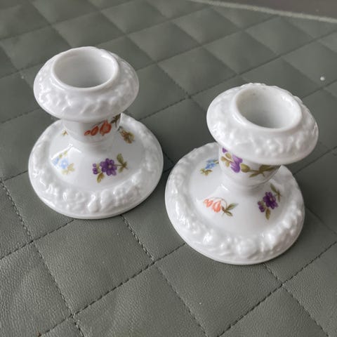 Kaksi posliinista kynttilänjalkaa, joissa on herkät kukka-aiheiset kuviot ja kullanvärinen reunus. Valmistaja Rosenthal (Kronach-Germany, Maljere) Kynttilänjalat ovat valkoisia ja niissä on useita eri värisiä kukkakuvioita. Kukkakuviot poikkeavat toisistaan. Halkaisija n. 8 cm ja korkeus n. 3,5 cm. Postitus onnistuu postimaksuja vastaan. Toisen kynttiläjalan kultauksessa vähän kulumaa. Hinta yhteensä 15 €.