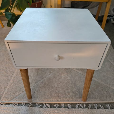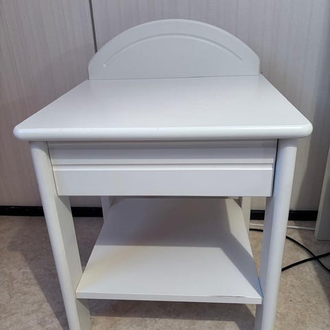 Vanha, tukeva yöpöytä. Elämisen jälkeä jonkin verran.