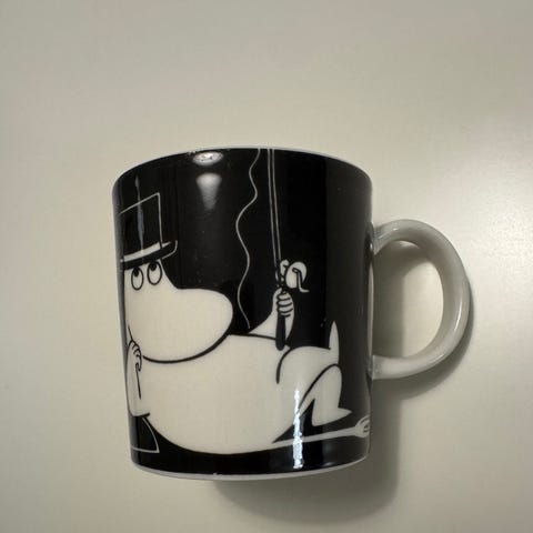 Myydään uusi Muumimuki; Muumipappa, harmaa muki 0,3l ja kasvopyyhe musta-harmaa 50 x 70cm.