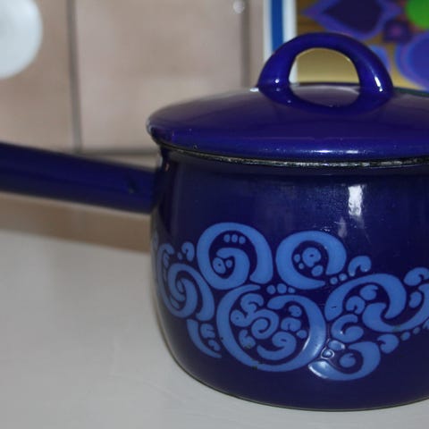 Emalin rikkoumat näkyvät kuvissa: kannessa ja itse kattilan reunoissa. Sisus ehjä.