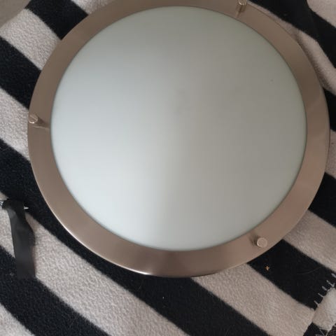 Hyväkuntoinen kattovalaisin. Varjostimen väri luonnonvalkoinen