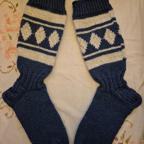 Itsekudotut Jussi villasukat. Lankoina Novitan Seitsemän veljestä harmaa ja Viking Garn Reflex heijastava pinkki lanka.