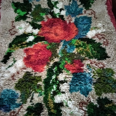 Hyväkuntoinen, ehjä ja puhdas Pirkkalan ruusuryijy. Mitat 165 x 96. Erittäin näyttävä, ei ole ollut eläintaloudessa. Nouto Naantalista.