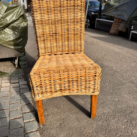 Hyväkuntoinen muuten Mutta yksi rottinki istumaosassa poikki Mutta ei haittaa kun tyyny päällä Ei näy eikä haittaa istumista Pehmusteita ei ole