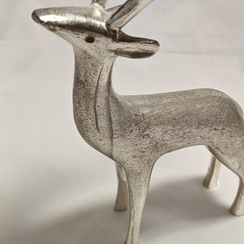 Pentikin 24 cm korkea hopeoitu porokynttelikkö. Ehjä ja kaikin puolin hyväkuntoinen, joskin yhdessä kynttiläkupissa on väriläiskät (katso lisäkuvat, eivät kylläkään ole ihan niin tummat kuin miltä kuvissa näyttää). Pinta on ihan sileää, eli hopeointi ei ole hilseillyt pois, mutta en tiedä, mistä tuo värjäytyminen johtuu. En ole yrittänyt sitä mitenkään poistaa. Olen kuitenkin huomioinut hinnassa. Lähetyskin onnistuu.