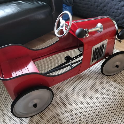 Peltinen polkuauto vankkatekoinen.Toimivat valot asennettu ,bmv merkki ja James Bond kilpi .
