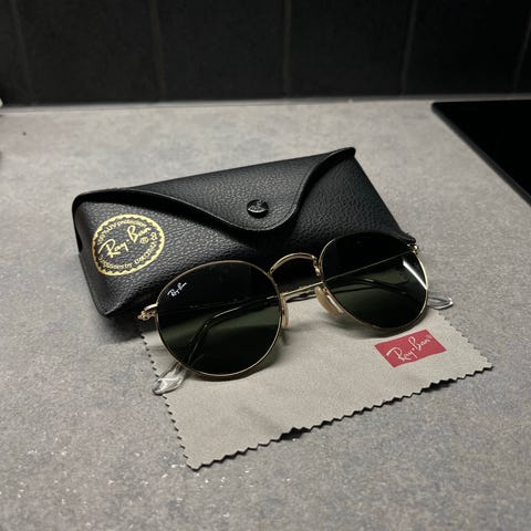 Ray-Ban Miesten aurinkolasit, joissa on kultaiset kehykset ja tummat linssit. Mukana tulee musta suojakotelo. Linssit naarmuttomat ja kehykset suorat.