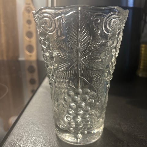 Punainen lasinen maljakko, jossa on kaiverrettuja koristekuvioita. Maljakon reunassa on pientä hammastusta. valmistaja ei tiedossa, korkeus noin 23,5cm ja kannasta n. 5,5cm ja ylhäältä noin 8,5cm, hinta noudettuna