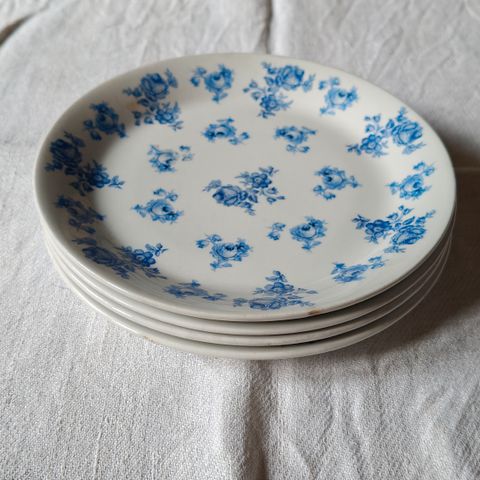 Teelautaset ¤14,8cm, isompi lautanen ¤17,3cm, kupin korkeus n 8cm. Kermakossa halkeama, muut ehjiä.