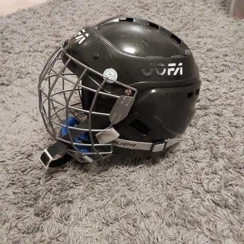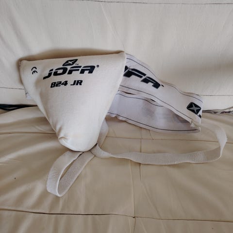 Jofa,Sweden,valkoisella värillä. Suoja on tarkoitettu jääkiekkoiluun ja tarjoaa kasvojen suojan pelitilanteissa.