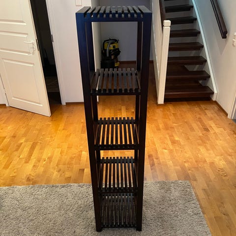 Harmaa metallinen hylly, kevyt joten helppo liikutella. Ehjä ja hyväkuntoinen, vain joitain pikkunaarmuja saattaa löytyä.