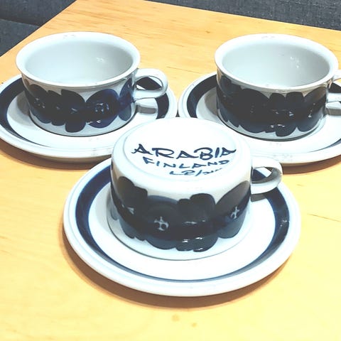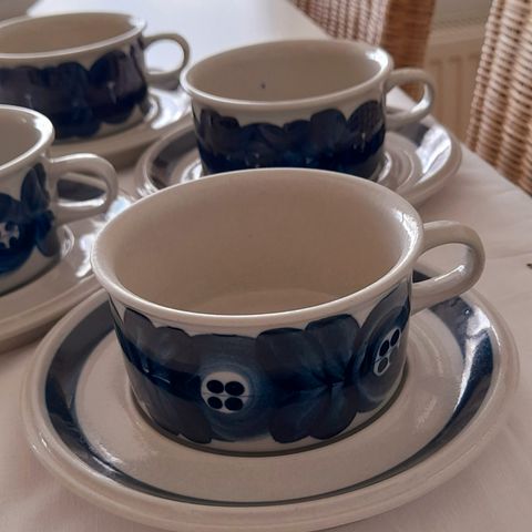 Kaksi Arabian Anemone-sarjan kahvikuppia tasseineen. Toisessa tassissa ulkopuolen pohjarenkaassa pieni valmistuksessa tullut valuvirhe, muuten siistikuntoiset. Kupin kork. 7,5 cm ja halk. 7 cm. Hinta yht. 40 e + postit. Toridiili tai normi postitus.