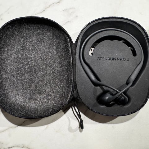 Pakkauksessa OpenRun-kuulokkeet, USB-C -latauskaapeli, suojapussi