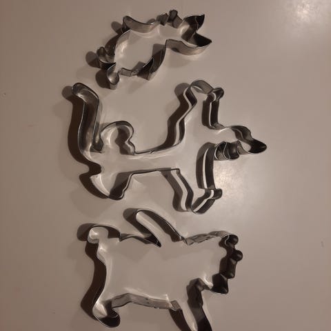 Kaksi tajotinta pyöreä puinen maku 42cm ja melamiini 38x23, isot piparimuotit 20 cm possu ja 18 cm henkilö ja 7 cm lumihiutale