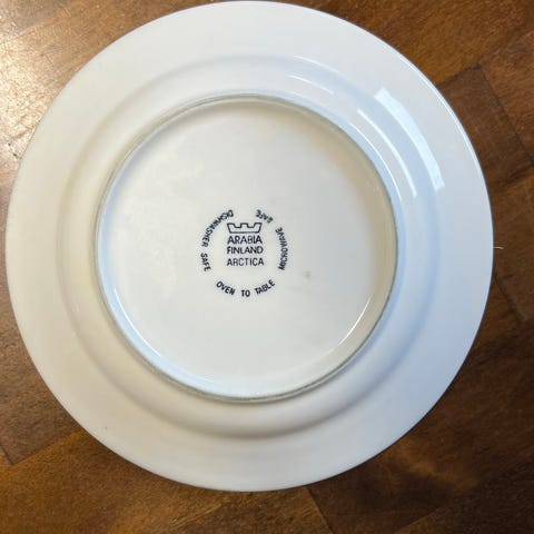 Arabia posliinilautanen, halkaisija 27 cm. Lautasessa on koristeellinen kukkakuvio ja sininen reunus. Sopii esimerkiksi tarjoiluun tai koristekäyttöön.