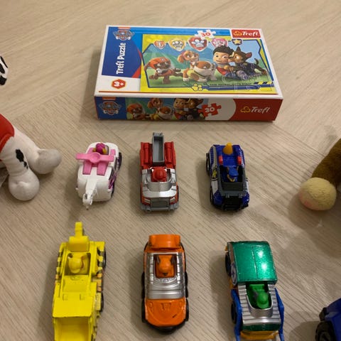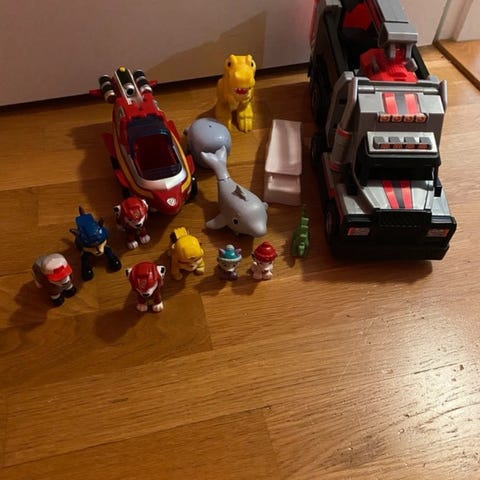 Ryhmä Hau lelusetti, joka sisältää useita hahmoja ja ajoneuvoja.