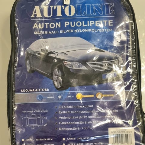 Auton puolipeite. Koko M. Kuvan Peite on tarkoitettu hatchback (pystyperäinen) malleille, kuten Volkswagen Golf, ynnä muut tasaperäiset autot. Pakkauksen päällä oleva sedan-mallinen auto antoi minulle virheellisen kuvan pakkauksen sisällöstä. Tämä on siis virheostos, jota en voinut palauttaa, koska kuitti oli jo kadonnut. Kyseessä siis, täysin uusi auton puolipeite. virheetön.