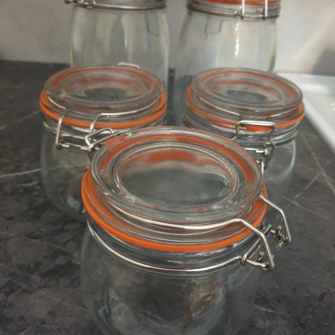 4 kpl lasisia säilytyspurkkeja kekseille, pipareille tms. Vas laitimmaisessa ei kantta muissa tiivis kansi. Kannelliset 6e/purkki, kanneton 4e. Kaikki yht.18e