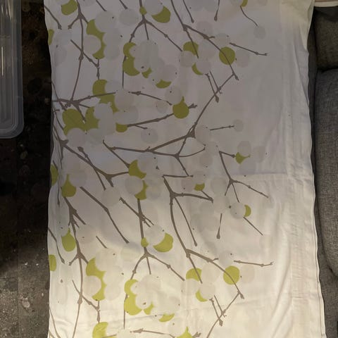 Marimekon valmiiksi rypytysnauhalla varustettu verhokappaa. Keskellä sauma, jossa näkyy tekstiä. Otin siitä kuvan